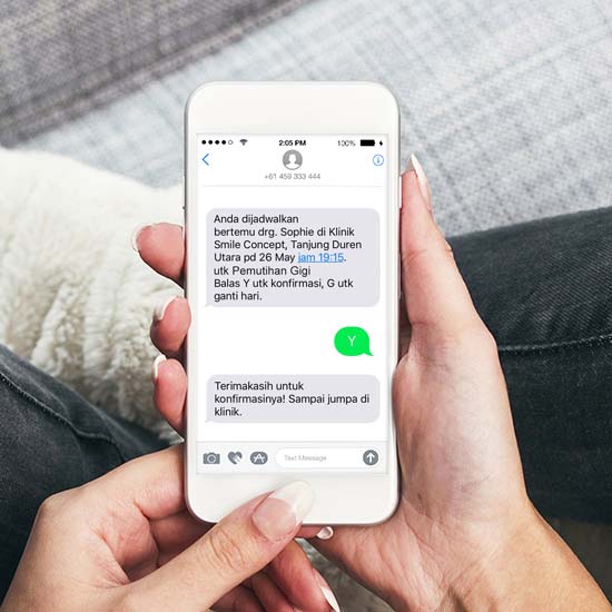 Pasien dapat menjawab konfirmasi via SMS dan hasilnya ditampilkan pada kalender dokter & klinik.